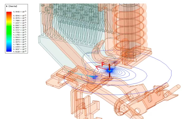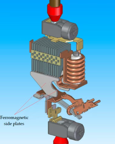 ● Синие спиральные кривые: Линии магнитного поля вокруг тока дуги указывают на то, что магнитное поле вокруг дуги распределено неравномерно, но смещено геометрией проводника и ферромагнитными компонентами.