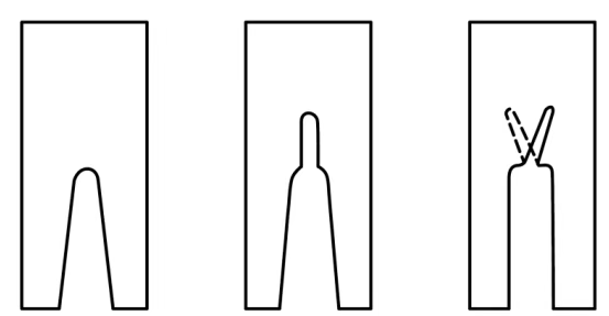 Типичные формы отверстий на входе в деионизационные решетки в дугогасительных камерах низковольтных выключателей контролируют путь входа, удлинения и расщепления дуги посредством геометрического дизайна. Три диаграммы соответствуют общим конфигурациям переменного и постоянного тока соответственно: