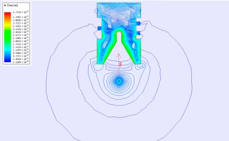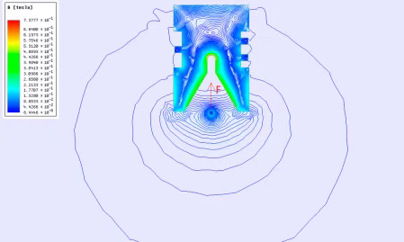 ● Градация цвета: Обозначает плотность магнитного потока — выше на изгибах проводника, вблизи катушек и входов в сетку.